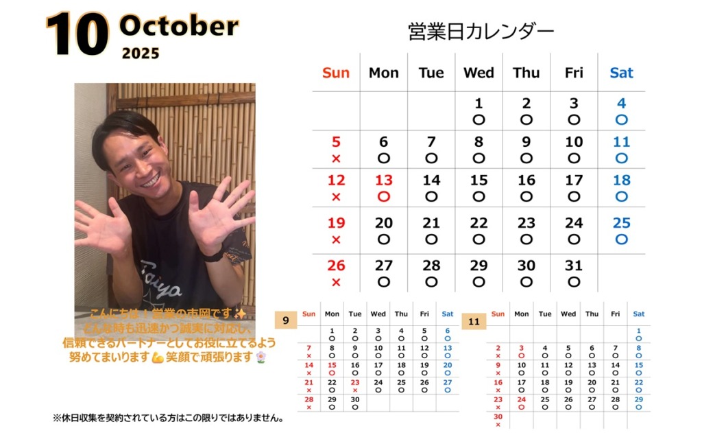 安心してお任せいただくためには、まずは わたしたちが信頼されないといけません。 お客様の場所へ直接出向くスタッフや処 理依頼を受け付けるオペレーターなど全 従業員に対して、身だしなみや言葉遣いに 至るまでマナー教育を徹底しています。