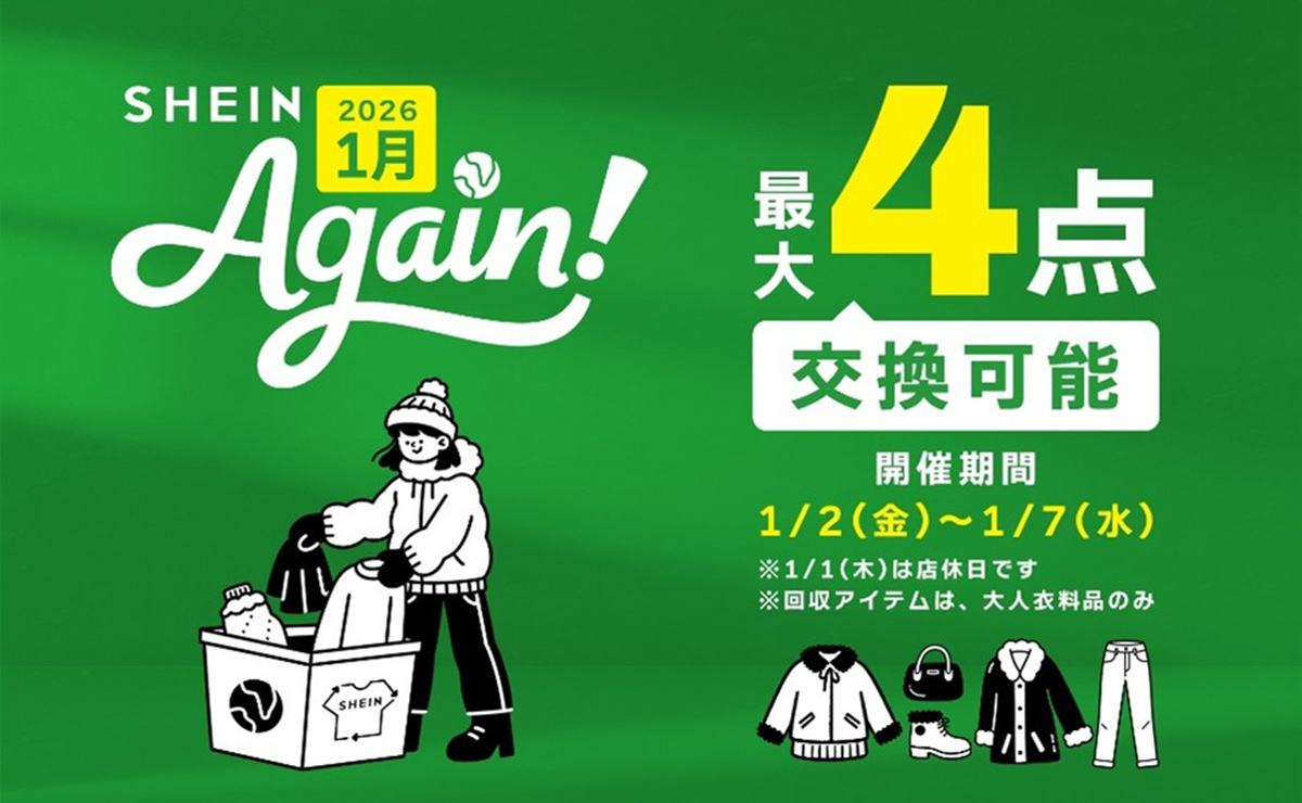 SHEINで購入した古着を持参すれば、新しい洋服やシューズ、バッグなどと交換できるというもので、2025年は12回のキャンペーンが原宿のショールーム「SHEIN TOKYO」で開催。