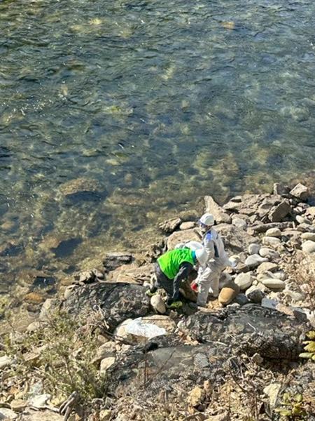 なんせガードレールから河に降りるまでの崖が凄まじい角度なので、運動量も凄まじいものとなります。
